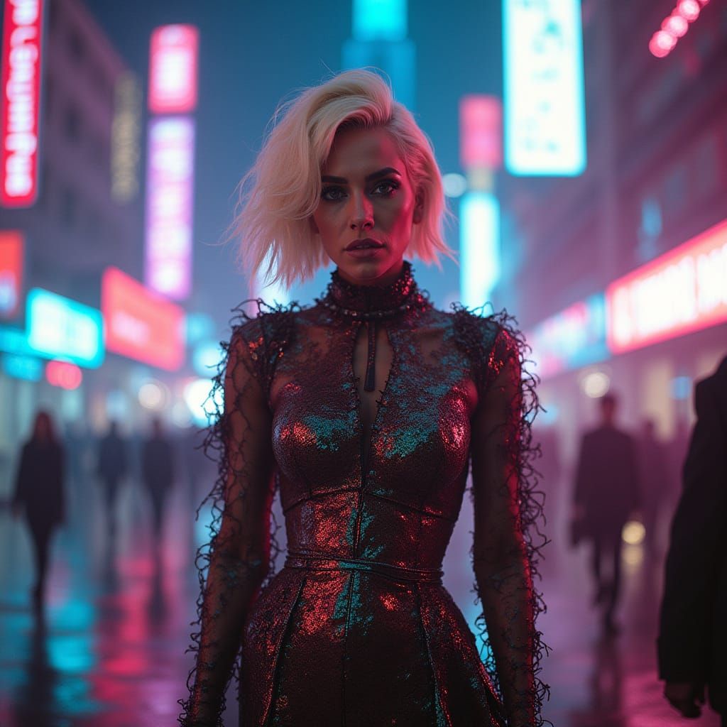 This image is a striking portrait of Lady Gaga, set against a futuristic cityscape with neon lights and holographic projections, blending high fashion and eco-awareness in a stunning avant-garde outfit made from recycled materials.