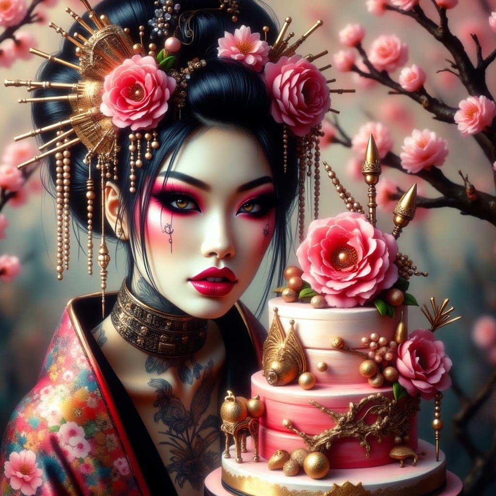 This image shows a geisha in punk attire posing with a luxurious cake. The aesthetic blends traditional elements with digital media, resulting in a hyper-realistic and ultra-detailed work of art.
