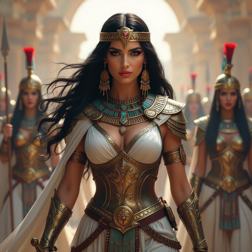 This image shows Cleopatra in armor, leading her royal guard. The portrait showcases dynamic lighting, hyperdetailed textures, and a vibrant color palette in a fantastical realism style.