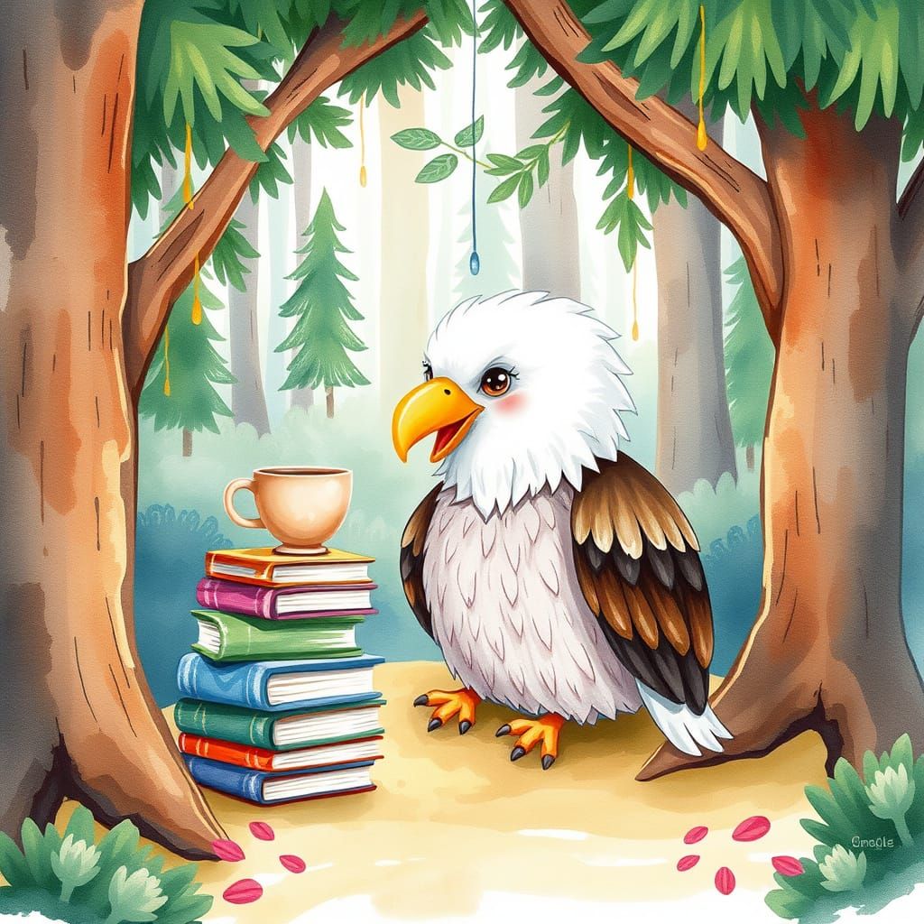 A charming watercolor of an eagle enjoying tea in a forest clearing, beside a stack of books. This splash and drip art style scene uses soft pastel colors to evoke warmth.