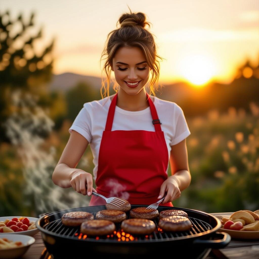 This photorealistic image captures a woman in a red apron cooking burgers on a barbecue during a stunning golden hour sunset. The shallow depth of field and cinematic lighting create a beautiful, high-detail scene.