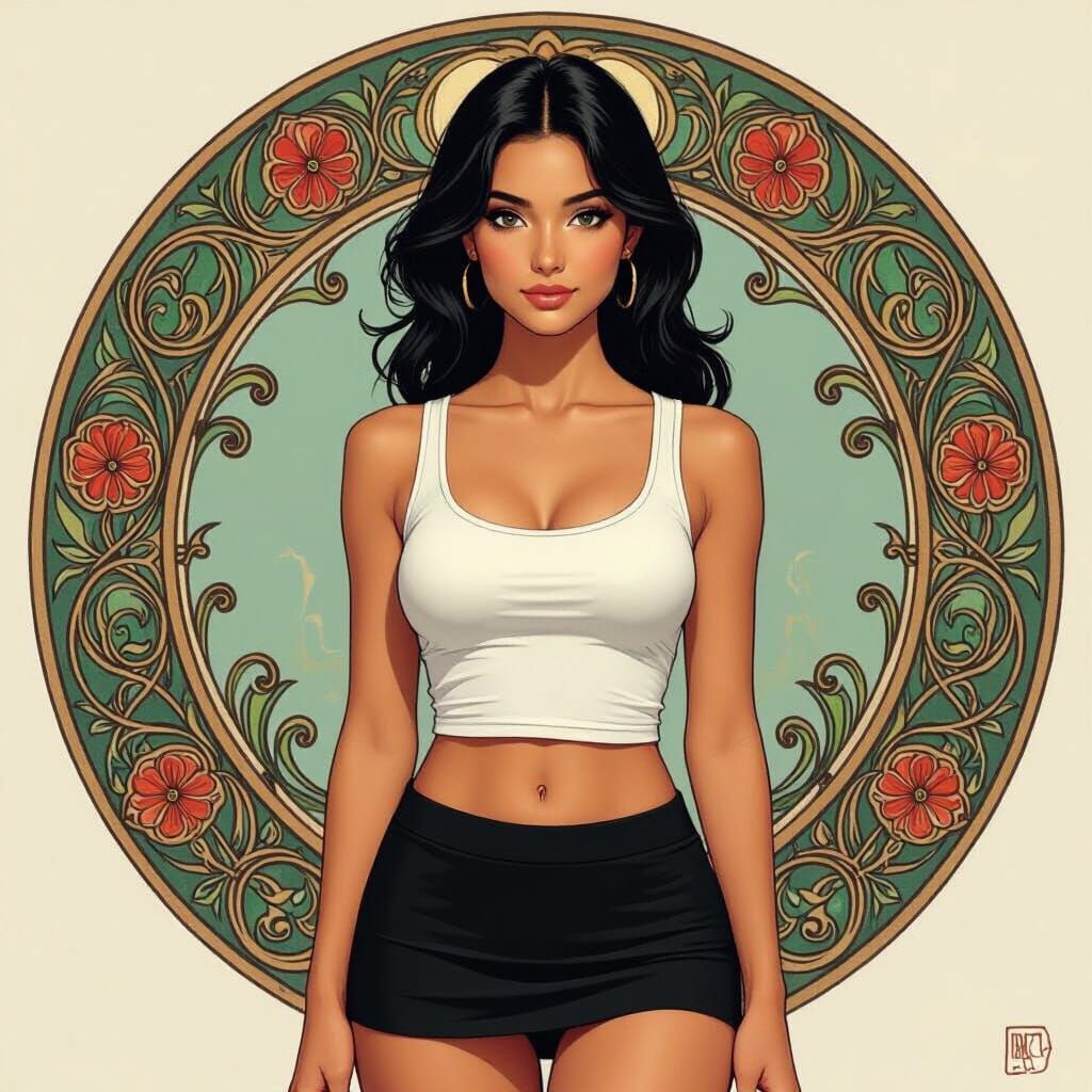 A striking picture of a 28-year-old Arabian girl in a white tank top and black skirt. The artwork features elegant lines, vibrant colors, subtle textures, and a soft, natural background in a digital art style.