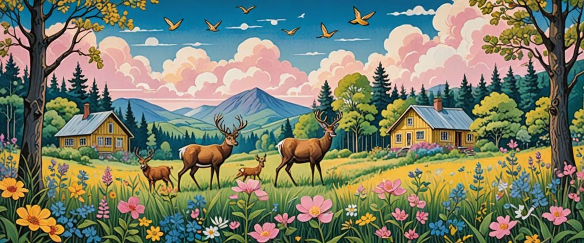 A vibrant folk art landscape of a mystical forest clearing at dawn. The image features a rustic cabin, deer, flowers, and birds under a blue sky with pink clouds, rendered in a naive style.