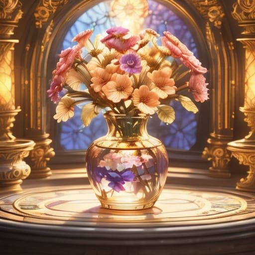 A close-up image of an antique porcelain vase holding illuminated glass flowers, bathed in a soft, warm glow. The digital art features intricate details and golden hour lighting.