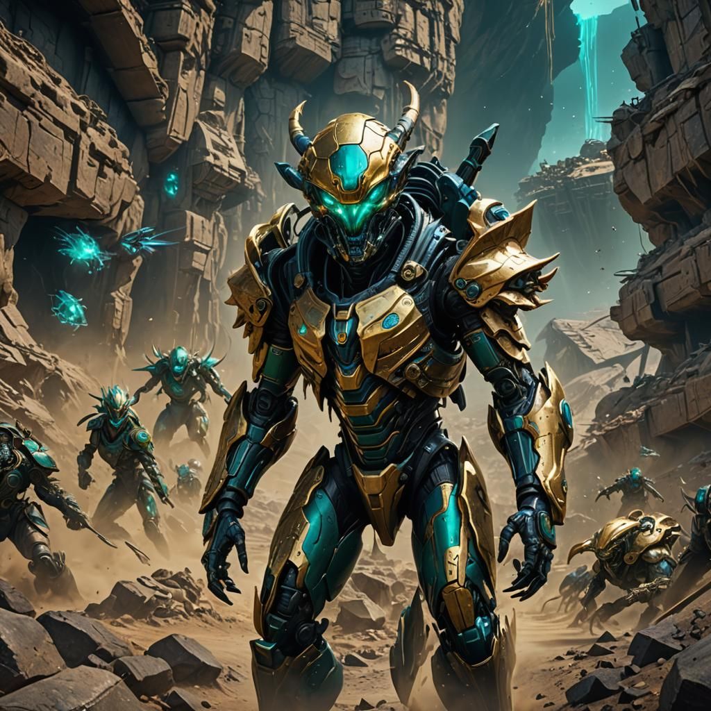 A highly detailed matte painting of a heavily armored alien invading a gold mine. The image features gold accents, bioluminescent blue-green glows and dramatic high-contrast lighting.