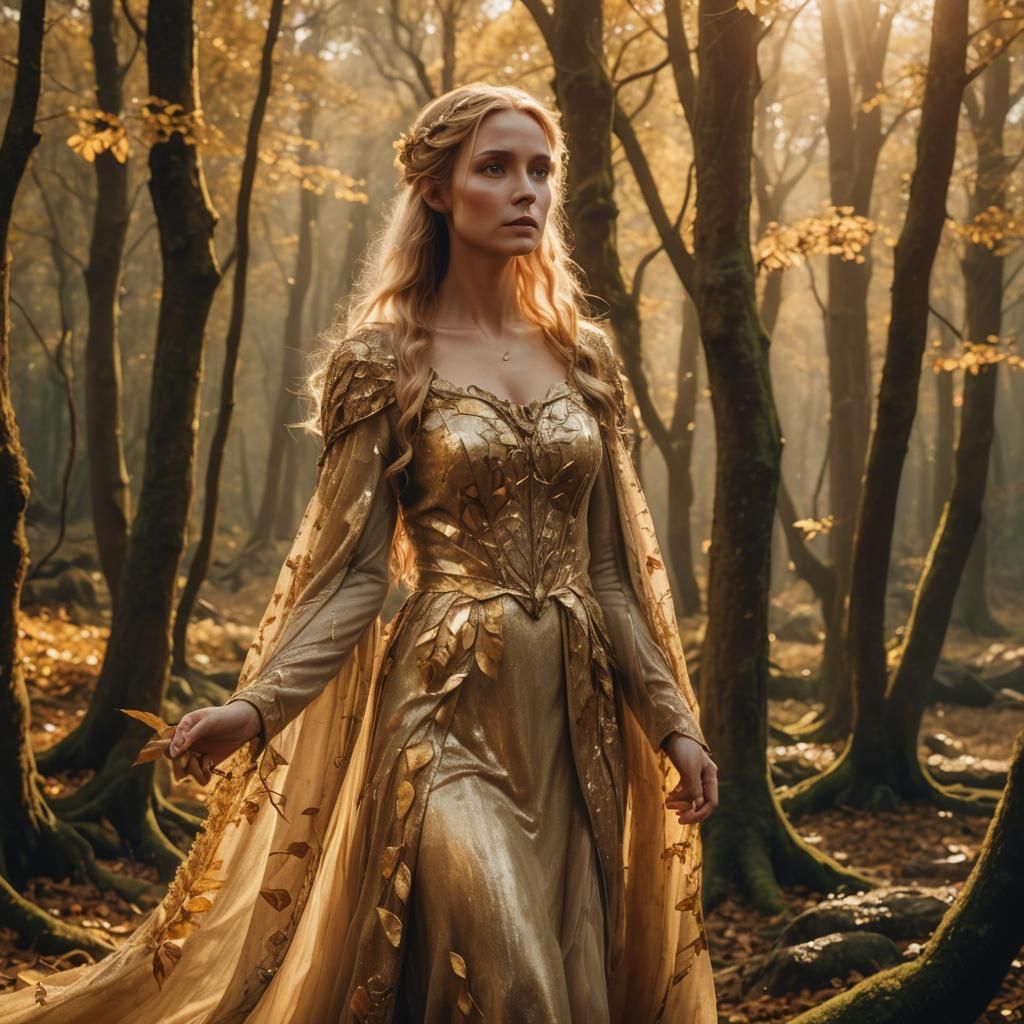 A cinematic shot of an elven princess with golden hair walking through a sunlit forest. She wears a shimmering gown in warm golden light with film grain and contrasty shadows.