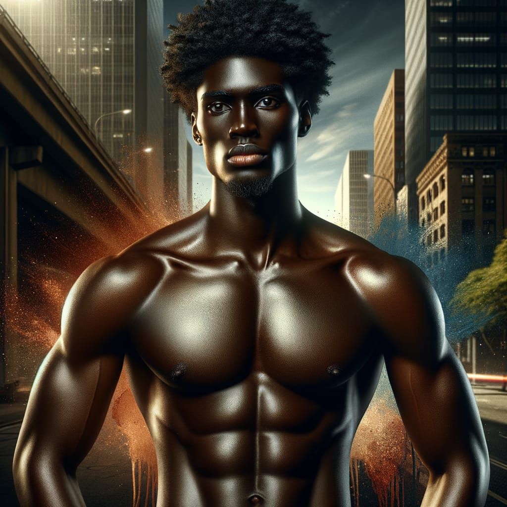 This image features a handsome, muscular Black man with deeply saturated skin and natural curls, set against an urban-nature backdrop. Dramatic lighting highlights his authoritative and serene presence.