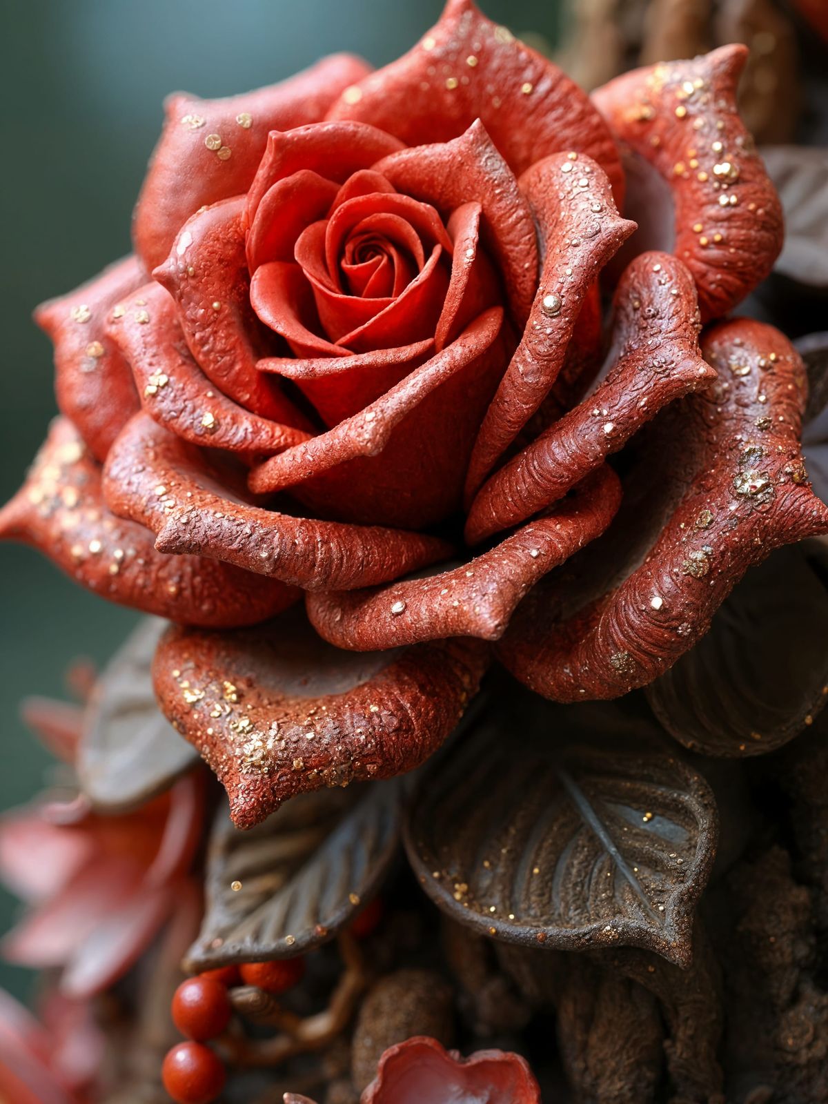 This image shows an ornate clay sculpture of a vibrant red rose. The rose is bejeweled with fractal gems, crystals and gold leaf, creating a luxurious and intricately detailed artwork.