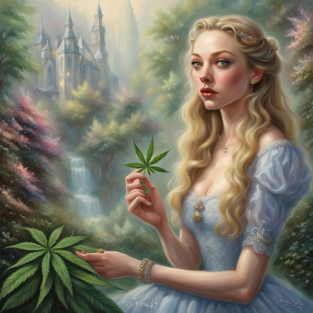 This image shows Amanda Seyfried in an ethereal, hyperdetailed fantasy setting, offering the viewer a cannabis bud. The image has a misty, dreamlike quality.