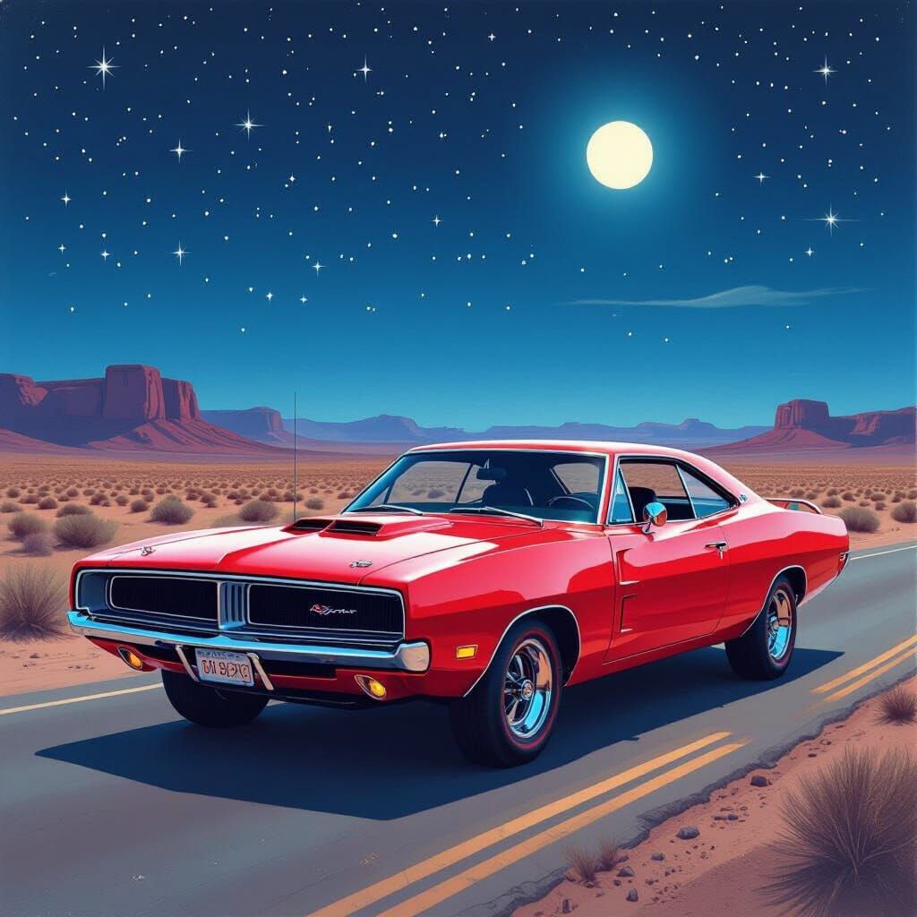 A stunning image of a red 1969 Dodge Charger on a desert highway at night. The artwork evokes a retro-futuristic airbrush style, reminiscent of 80s sci-fi movie posters.