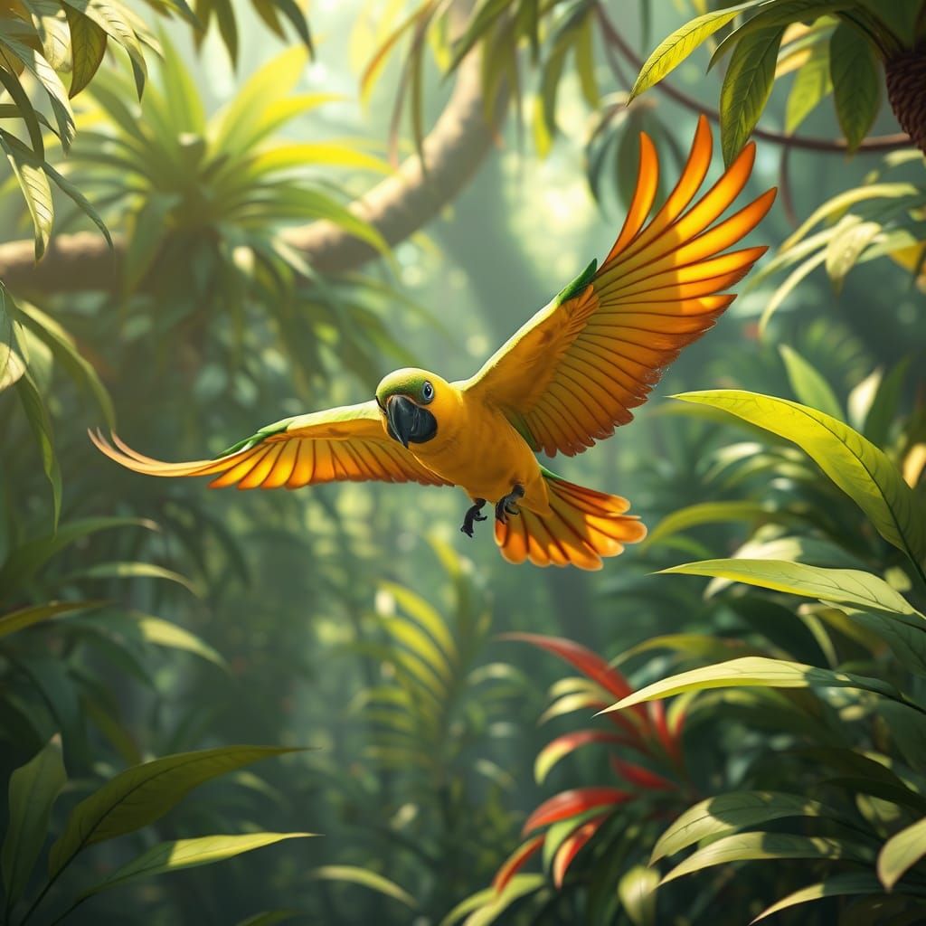 A 3D anime style image of a colorful parrot in flight. The parrot soars through a vibrant jungle rendered with fine detail and aesthetic qualities.