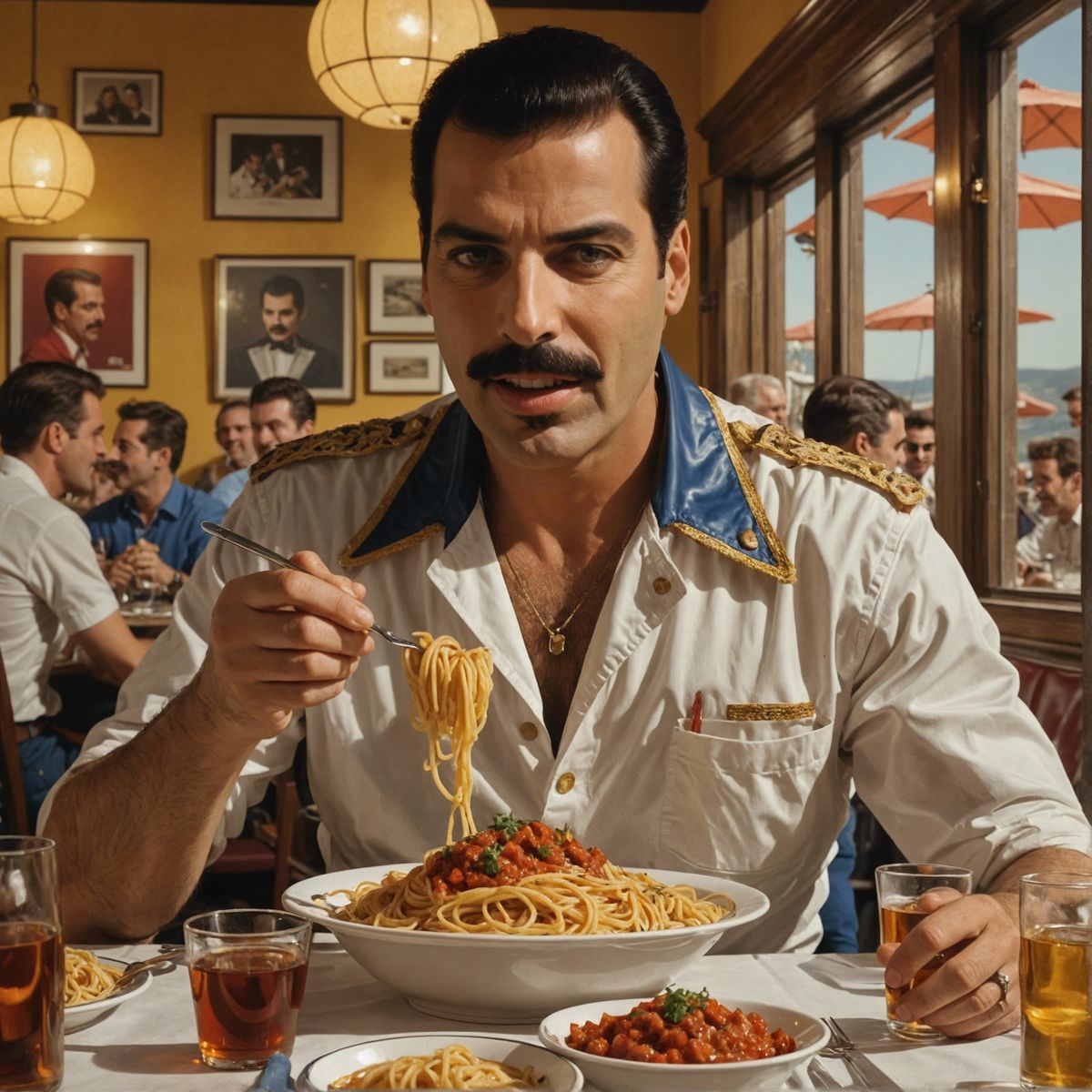 A photorealistic image of a cheerful man enjoying spaghetti at a restaurant. The image is hyperdetailed with perfect proportions, reminiscent of pin-up art.