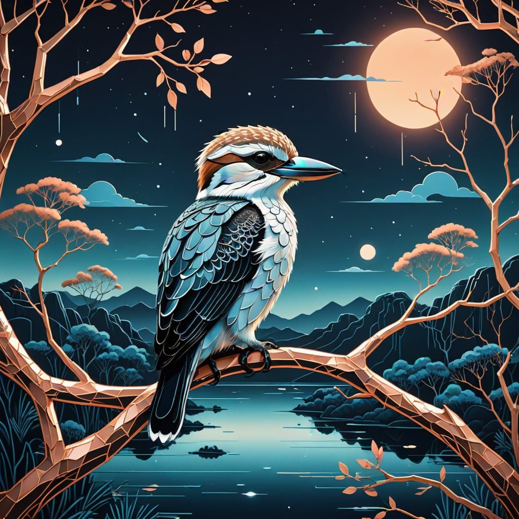 Bold 2d copper lines. A kookaburra perched on a branch of a bioluminescent tree, surrounded by floating islands in a twilight sky. The style is high-contrast and geometric shapes, with a metallic sheen and bold outlines, reminiscent of Art Deco posters but with a fantasy twist. Soft, glowing light, dreamlike ...