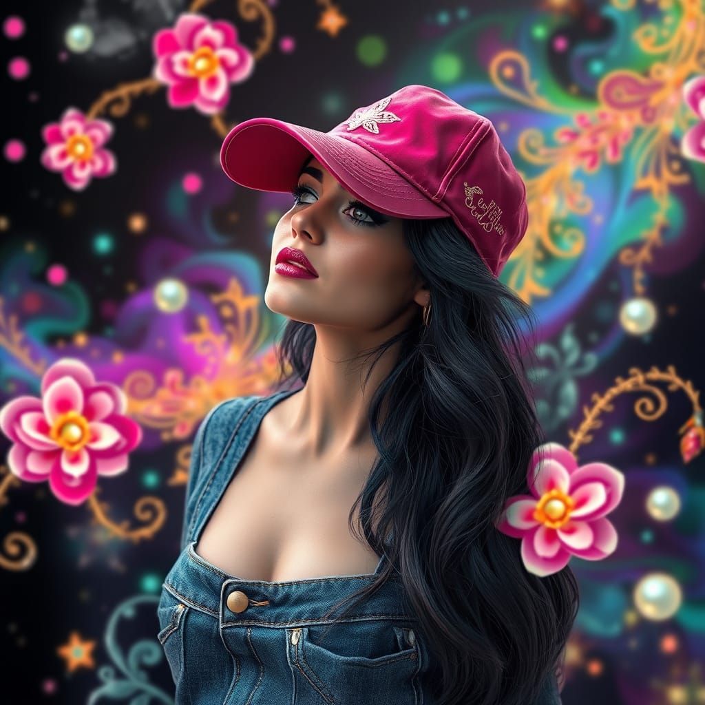 This image showcases a woman in a fairy-tale fantasy setting, adorned with intricate golden lace and pearlescent beads against a backdrop of vibrant colors. Created in a modern 5D digital art style.