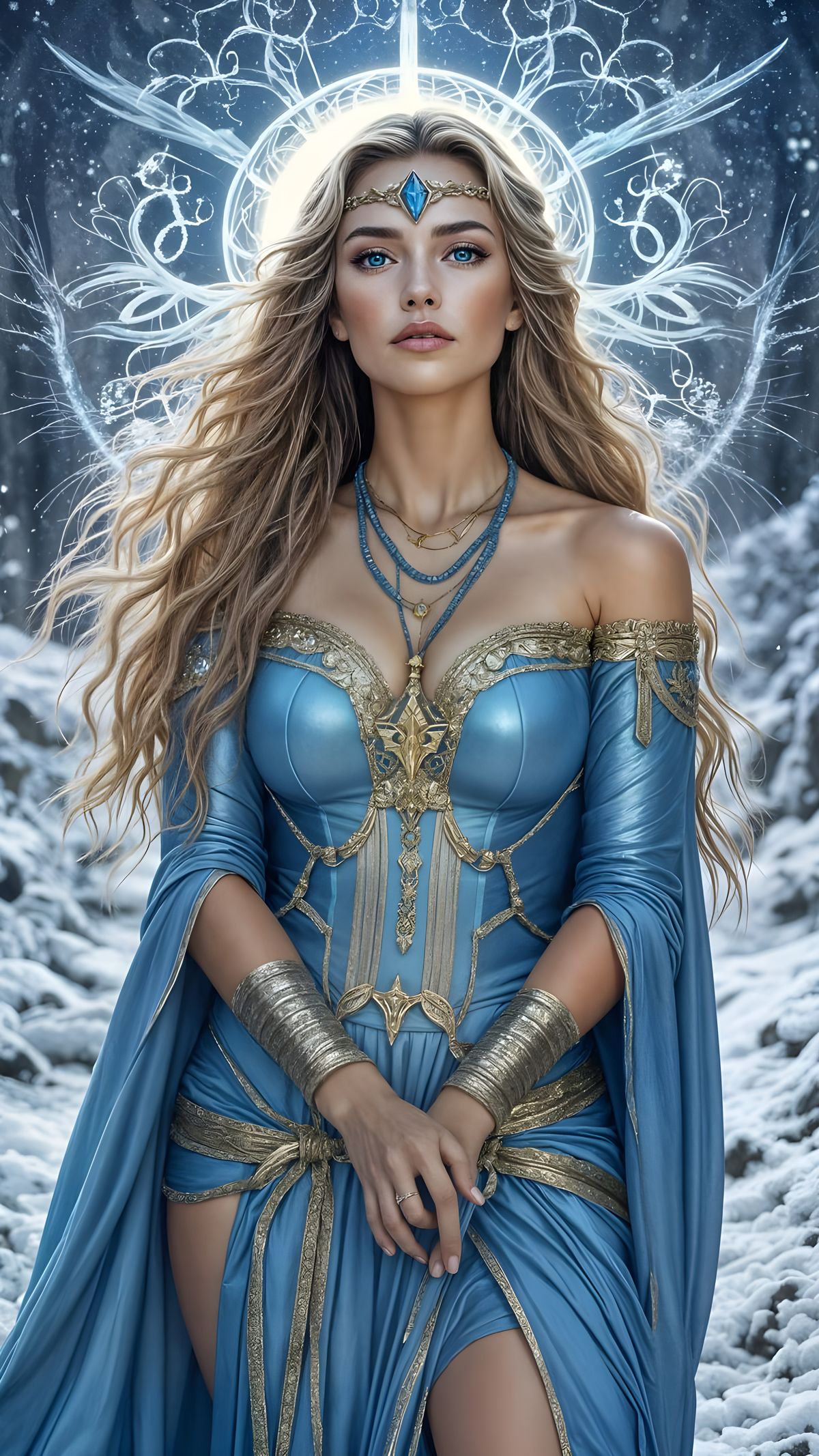 A majestic vision of winter's untamed beauty, this sorceress stands at the heart of her frozen dominion, radiating elegance and elemental might. Her frost-blue eyes glow with ancient magic, as intricate silver runes and forgotten sigils shimmer on her icy skin.