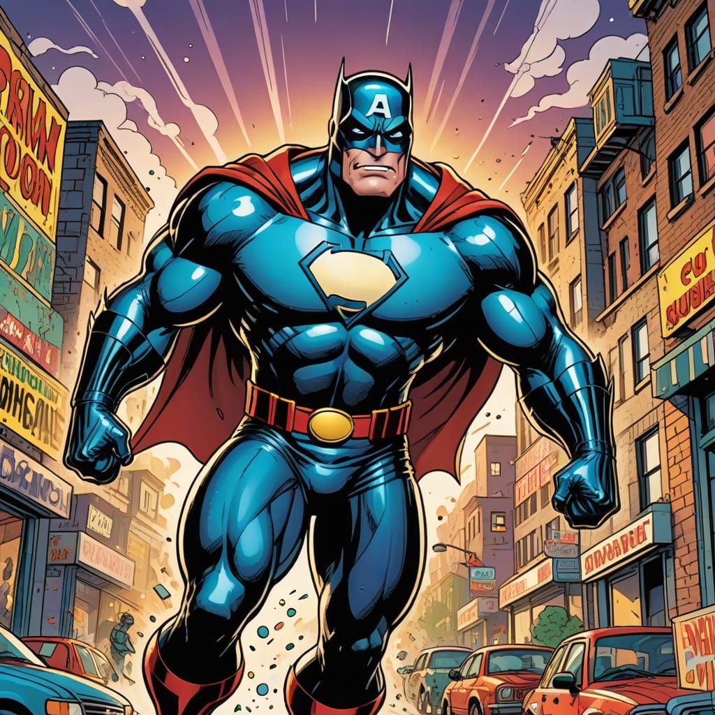 This vibrant image captures a comical superhero trapped in a shiny plastic blister pack, reminiscent of 90s toys. With bold, bright colors and hyperdetailed textures, this retro comic book art piece exudes a nostalgic, dreamy quality.