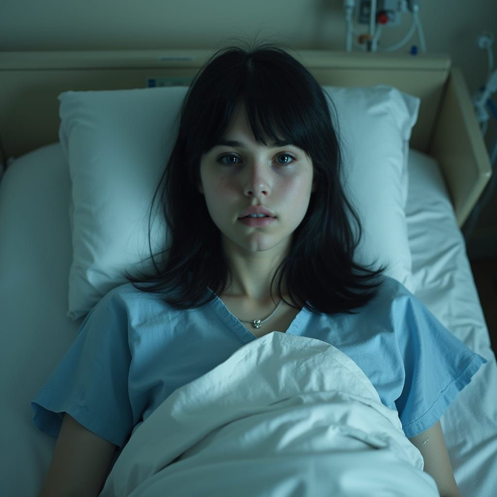 A photorealistic image of a young woman in a hospital bed with medical equipment. The scene evokes a somber mood through soft lighting and a muted color palette.