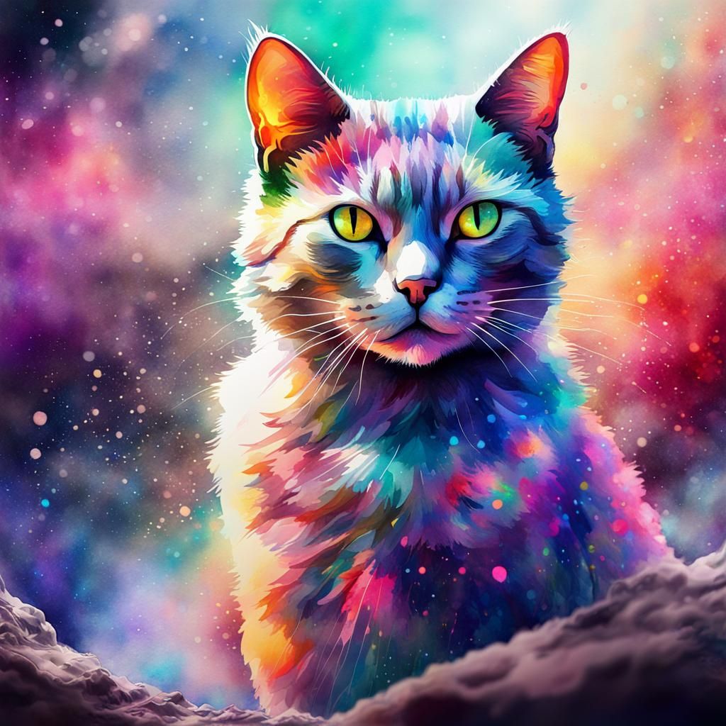 This image showcases a cat in a dynamic splash art style, rendered with watercolor effects. The artwork features an 8K resolution with holographic, astral, and cosmic elements, in mixed media.