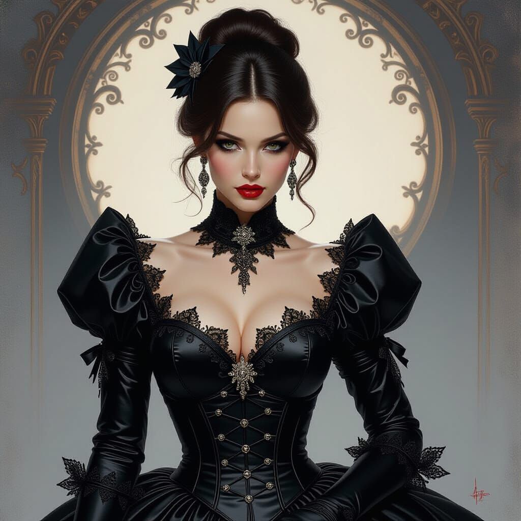 A striking picture of a reflective silver android woman in shadowy Victorian clothing. This dark fantasy art combines biomechanical elements with a lush, vibrant oil painting style.