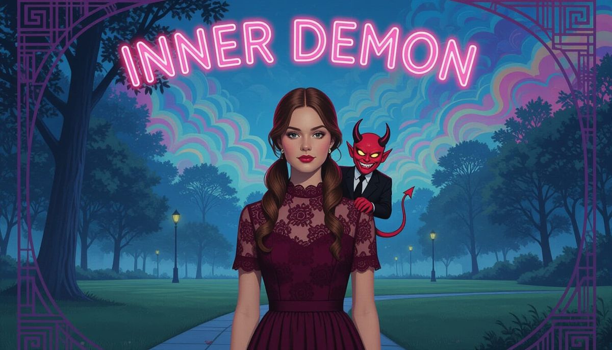 A striking picture of a young woman in a burgundy lace dress standing in a misty park. A grinning demon sits on her shoulder, beneath neon text, against a psychedelically colored backdrop with art deco patterns.