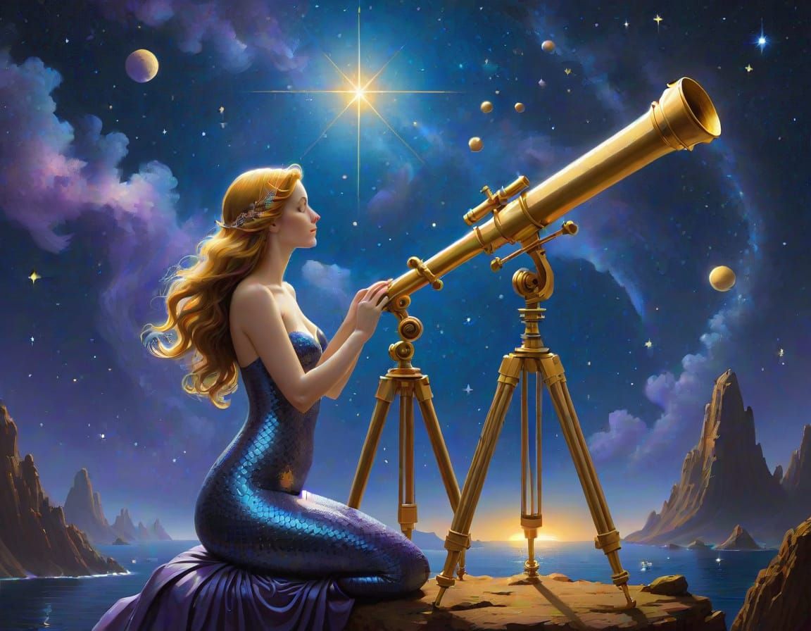 A striking picture of a mermaid gazing at stars through a telescope. The image blends space art with classical painting techniques and features a color palette of blues, purples, and golds.