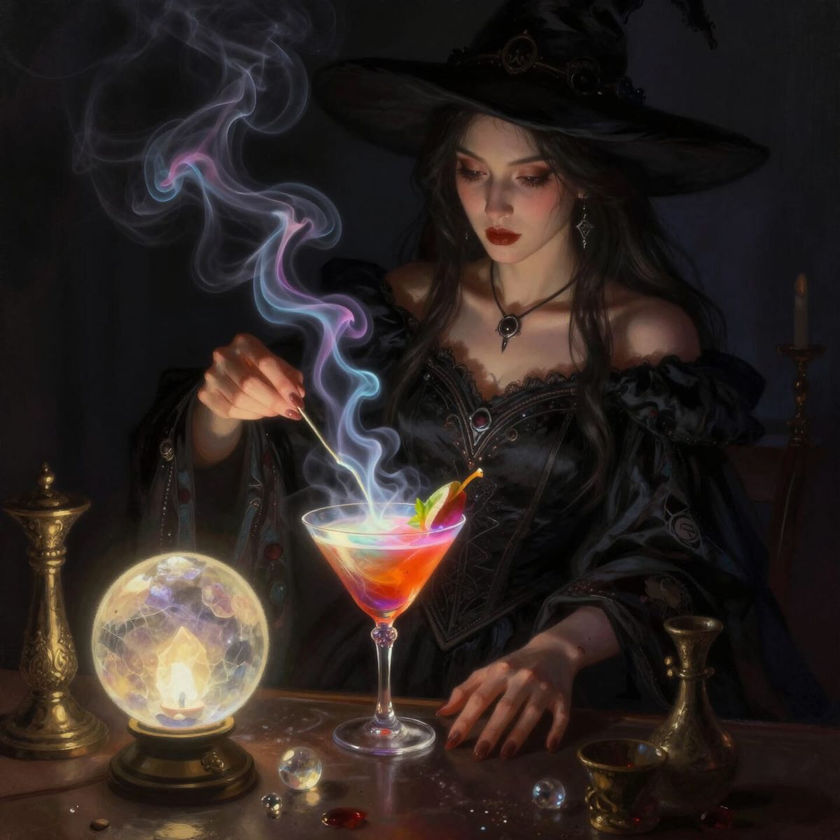This image shows a witch in a black gown preparing a glowing cocktail, with smoke rising near a crystal ball. Rendered in a dark fantasy digital painting style with dramatic lighting.