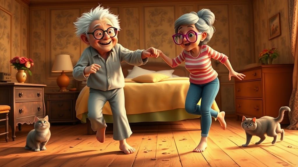 A heartwarming scene of an elderly couple dancing together in a warm, golden-lit bedroom, surrounded by nostalgic details and a playful atmosphere, reminiscent of a whimsical Pixar-inspired 3D style.