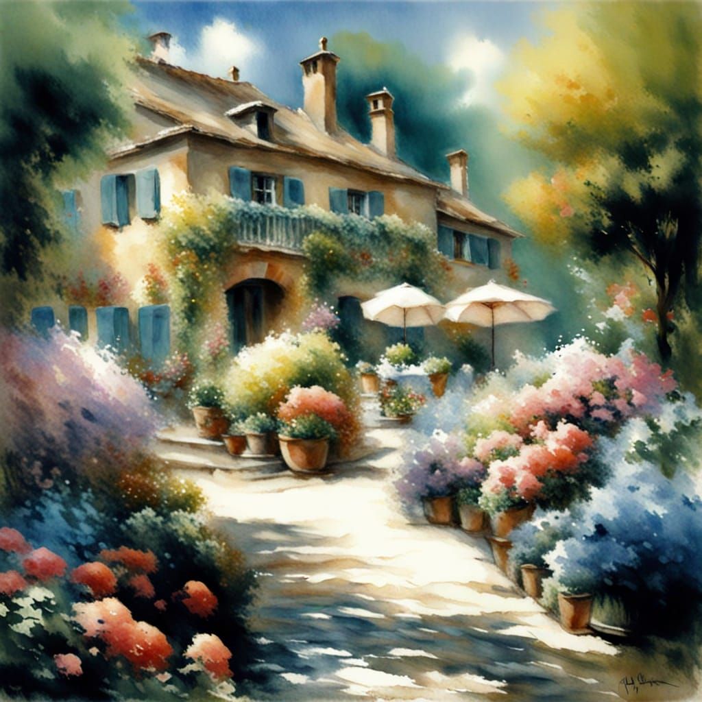 A delicate watercolor painting featuring soft, airy brushstrokes in a dreamy impressionistic style. The artwork emphasizes light and subtle color gradations to create a tranquil, ethereal scene.