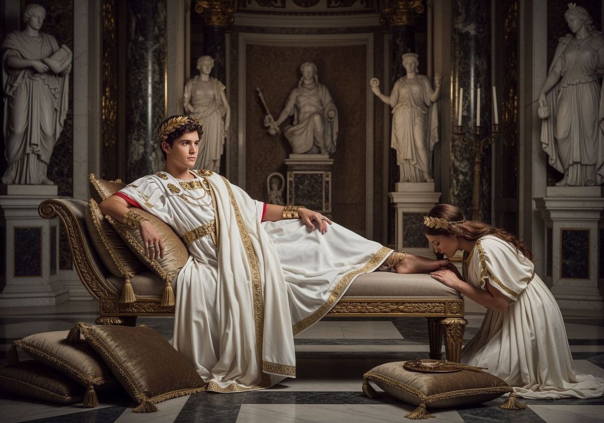 This image shows a young Roman emperor in an opulent palace. He wears a white and gold toga and reclines on a chaise lounge while a priestess kneels before him. The scene is captured with soft, natural lighting.