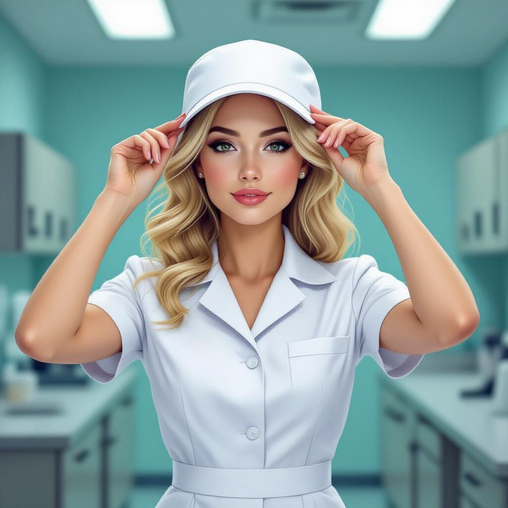 A portrait of a young nurse adjusting her cap in a bright medical office. The image is rendered with delicate lines, vibrant colors, and digital realism, in a modern illustrative style.