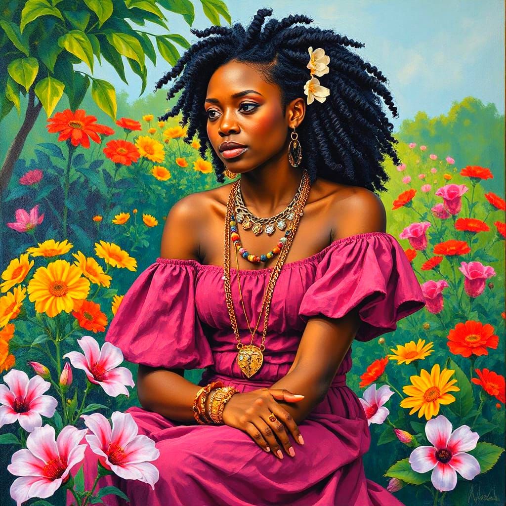 This image captures a beautiful African American woman sitting graciously in a lush garden, surrounded by vibrant flowers, with intricate textures and expressive brushstrokes blending acrylic, oil, and watercolor tints, reminiscent of a mixed-media masterpiece.