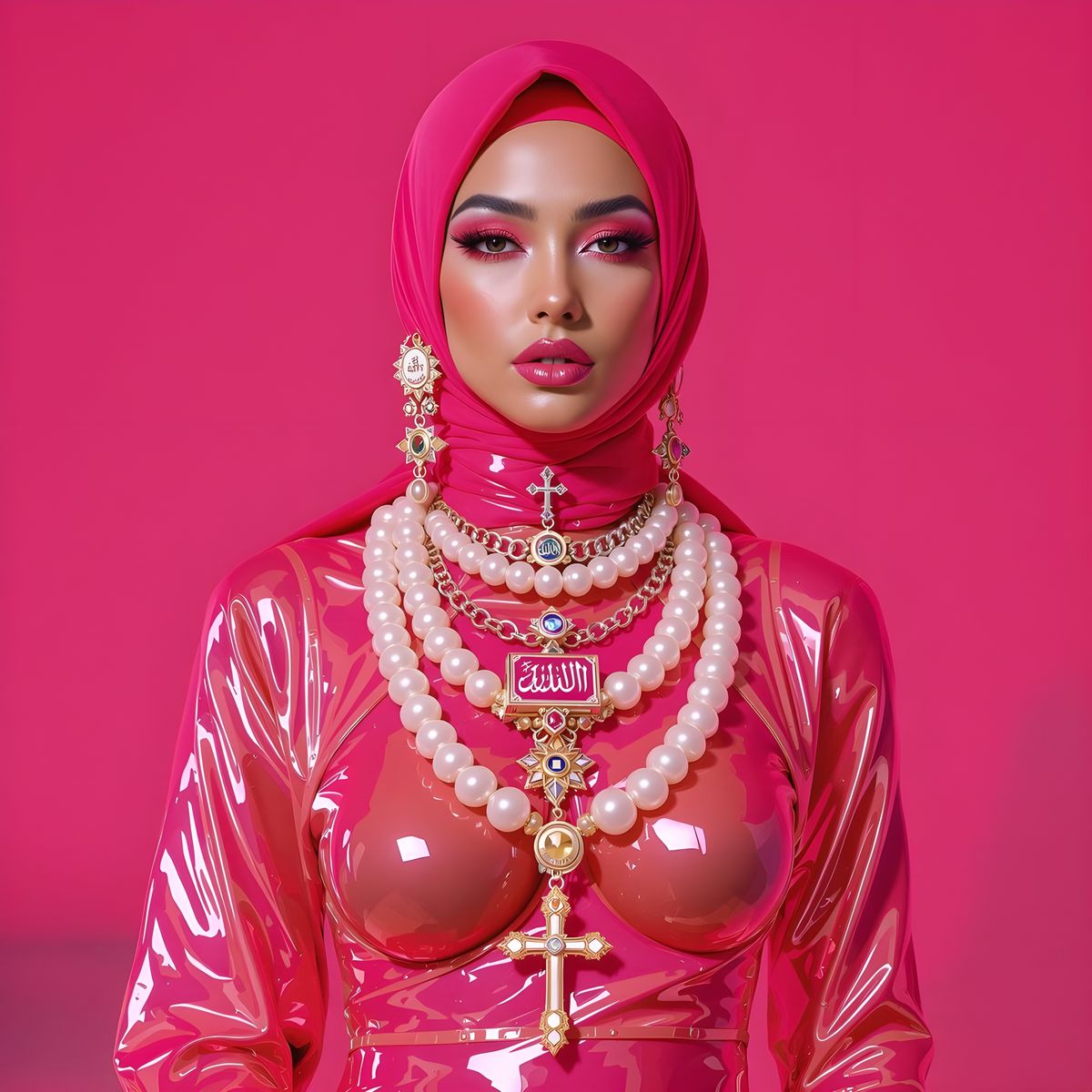This image shows an Asian woman in a hijab and latex outfit, accessorized with jewelry. This digital artwork features vibrant, bold and sleek aesthetics.