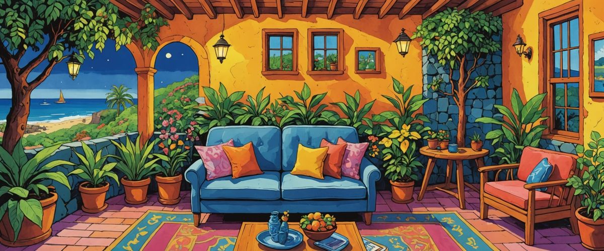 A vibrant folk art style image of a lanai with an outdoor sofa. The scene features oriental themes, stone walls, exotic plants, and volumetric lighting in cheerful, bright colors.