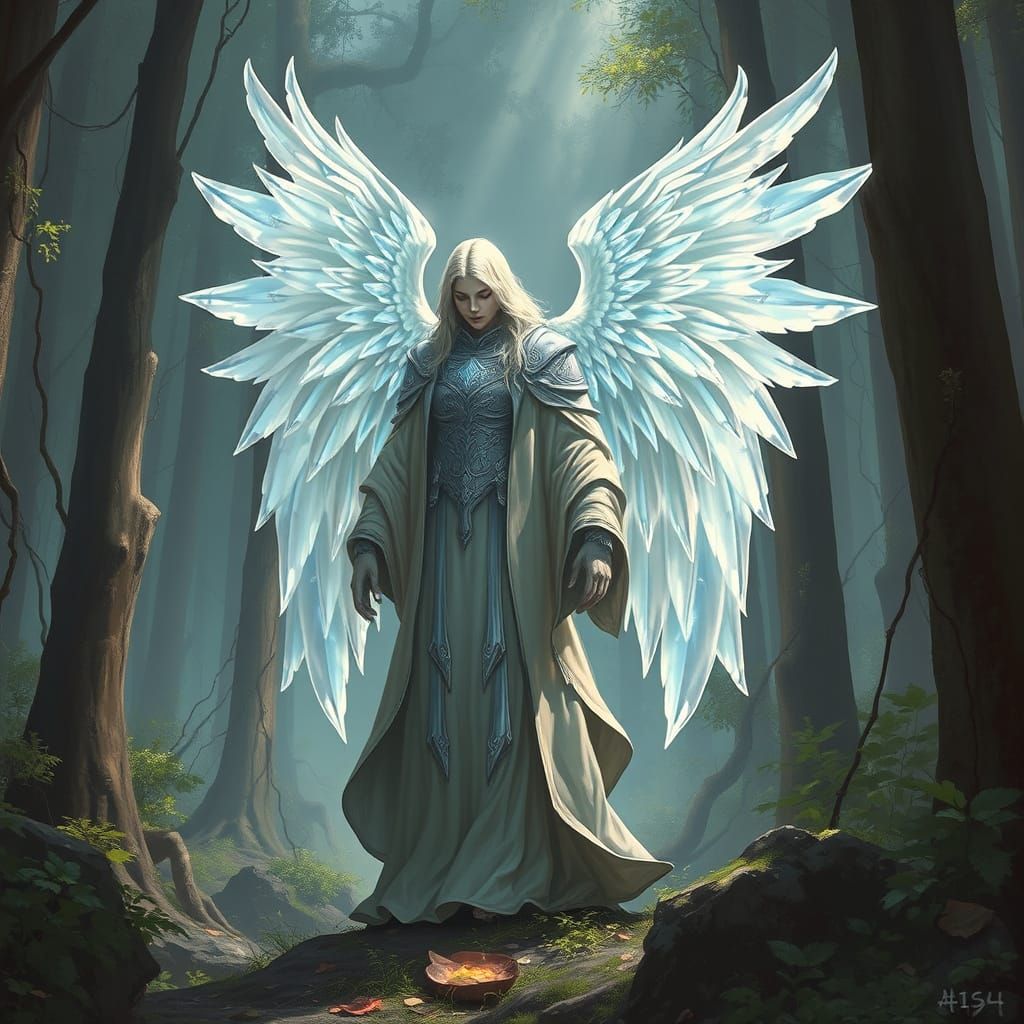 This image depicts a powerful, crystal-winged angel standing amidst a neglected, overgrown forest. The angel's crystal wings reflect and refract light, blending futuristic and dystopian elements in a striking visual representation.
