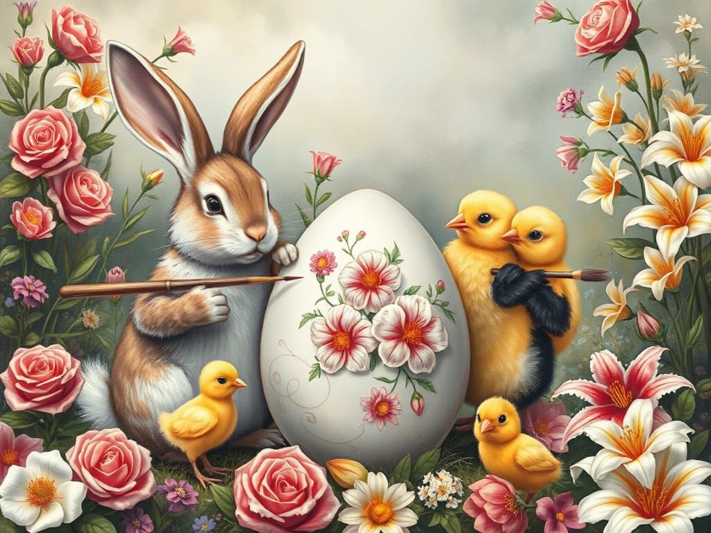 A charming image of two bunnies and two chicks painting Easter eggs. The scene is set in a whimsical, colorful landscape filled with flowers, rendered as a hyperdetailed charcoal drawing.