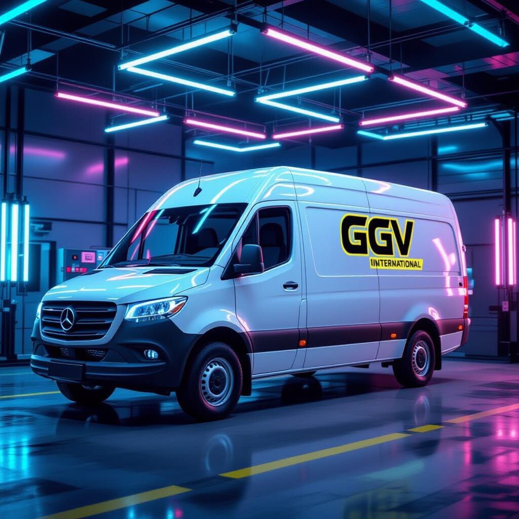 This image shows a white 2020 Mercedes Benz Sprinter in a retro garage. The van features a black and yellow "DGV Trans International" logo, all rendered in a cyberpunk aesthetic.