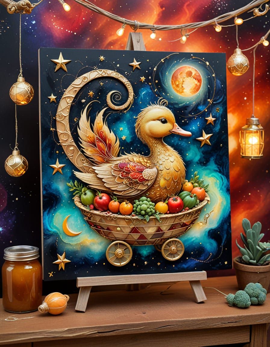 A surreal, richly textured painting of a Native American woman on a lunar base. Features delicate golden tendrils and earthy tones, evoking a dreamlike, mixed-media masterpiece with vibrant brushstrokes.