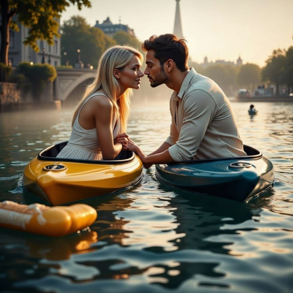 A romantic scene of a couple in kayaks under Paris's Pont Alexandre III, with mist and shimmering reflections. The city awakens as they lean close.