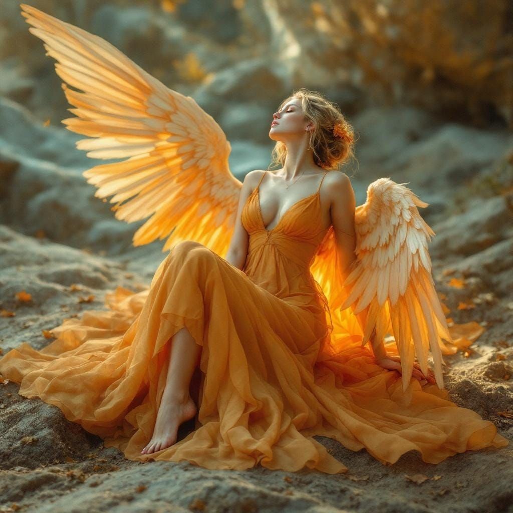 A beautiful image of a fantasy angel woman with soft, gentle features. The image is bathed in warm orange tones, creating a serene and ethereal atmosphere.