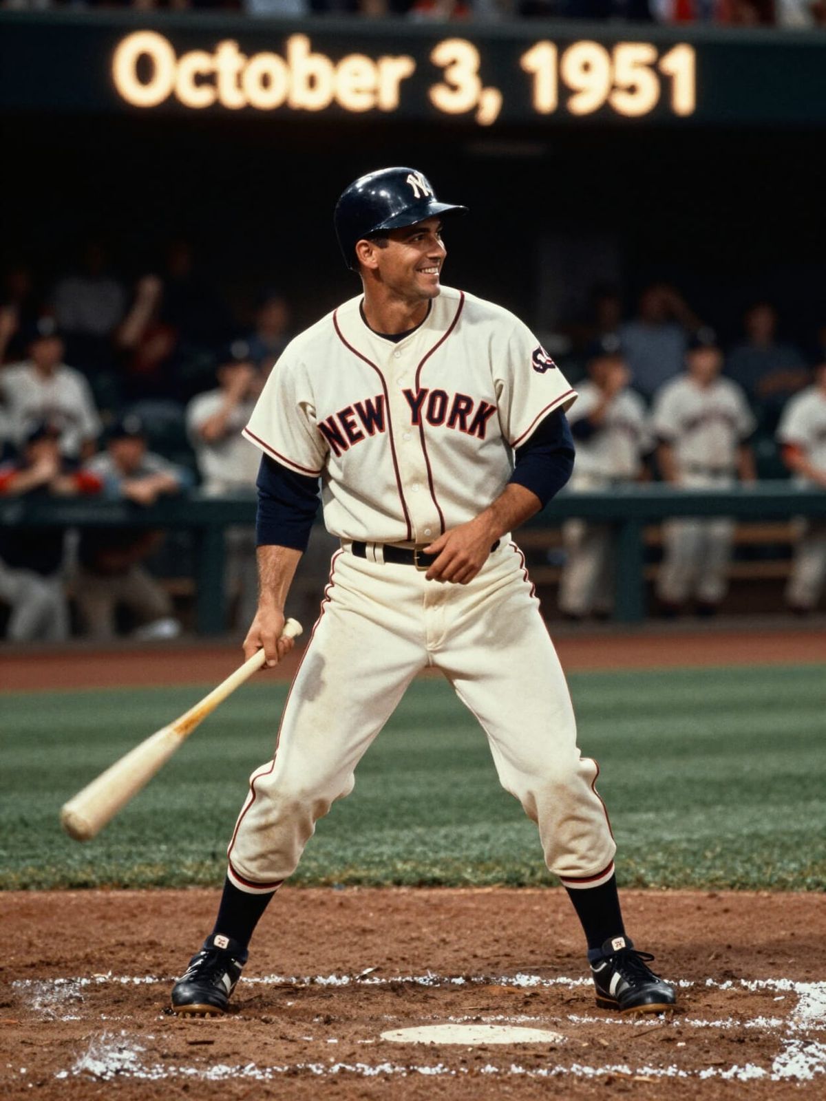 This image captures a cinematic moment of Bobby Thomson hitting a home run for the New York Giants on October 3, 1951. It features film grain, vignette, and dramatic lighting for an epic feel.