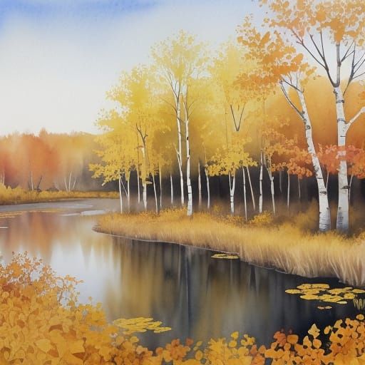 This image shows a minimalist watercolor painting of autumn birch trees surrounding a tranquil pond. The yellow leaves of the trees reflect in the water in this serene landscape.