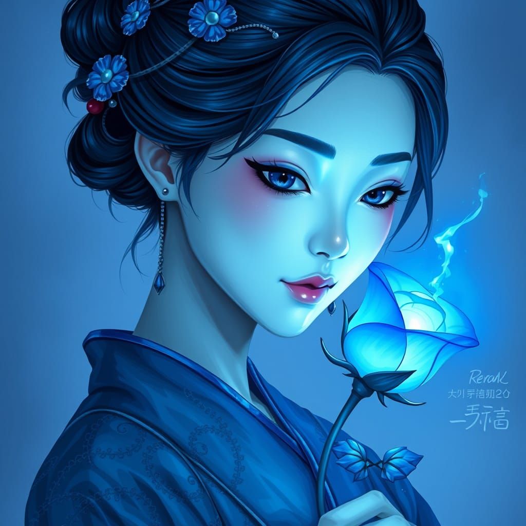 This image shows a detailed digital painting of an Asian woman with blue skin and hair, wearing a blue robe and holding a glowing blue rose. The artwork is rendered entirely in shades of blue.
