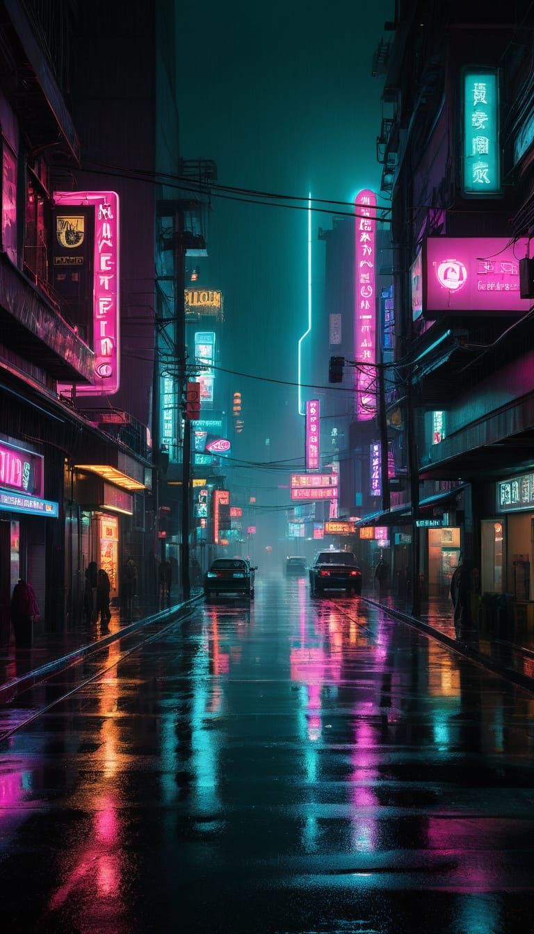 This image captures a futuristic city scene with vibrant neon lights reflecting off wet streets, creating a contemplative atmosphere of quiet anticipation and mystery.