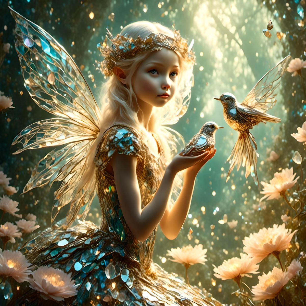 A captivating image of a fairy cradling a small, plump bird amidst a fairy glade. The artwork is highly detailed, with fairies fluttering by in synchronized chaos and stunning beauty.