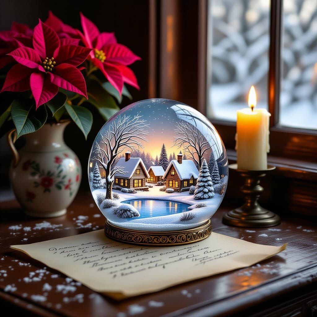 This image showcases a detailed miniature winter village inside a frosted glass paperweight, resting on an antique desk with a letter and poinsettias, bathed in candlelight.