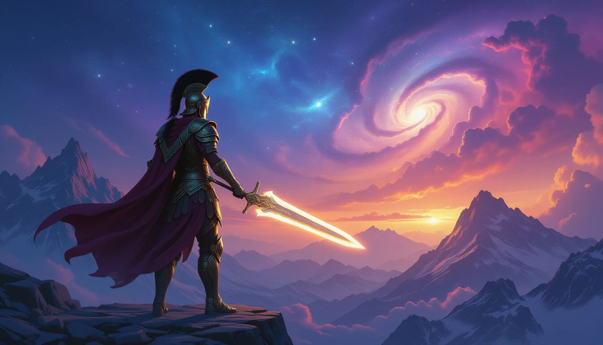 This digital matte painting depicts a warrior in ornate Greek-inspired armor, holding a glowing sword on a mountain. The epic fantasy scene features a nebula sky with vivid, saturated colors and strong backlighting.