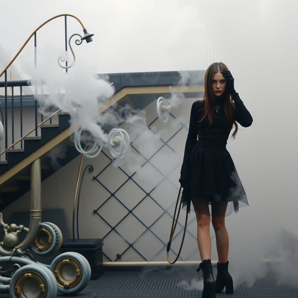 This image shows a goth fashion model in a foggy, biomechanical coffee shop. The scene blends industrial and mystical elements with dramatic lighting and deep, moody colors, inspired by surreal dark art.