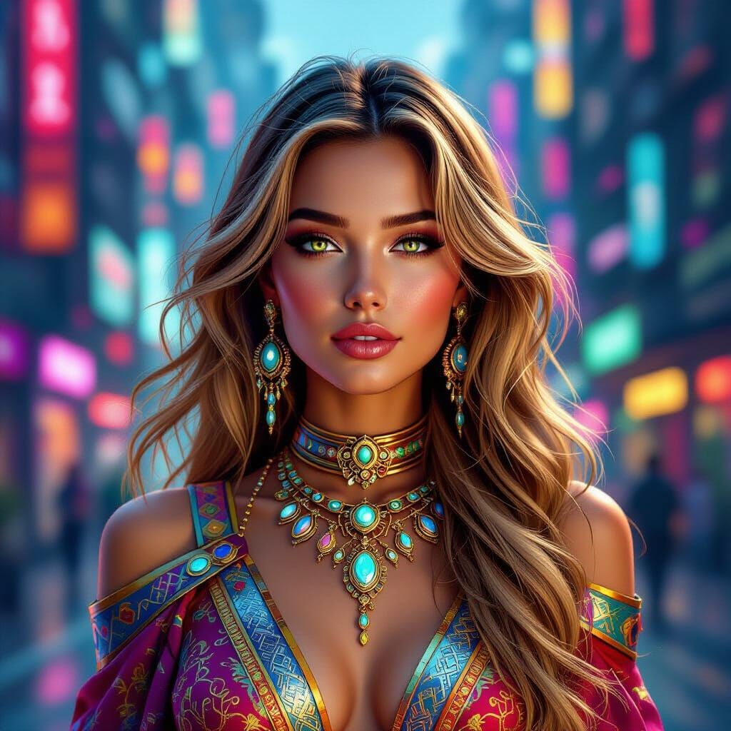 A striking picture of a woman with golden hair and jewelry in a futuristic city. The image features vibrant colors, intricate details, and neon lighting in a hyperrealistic style.
