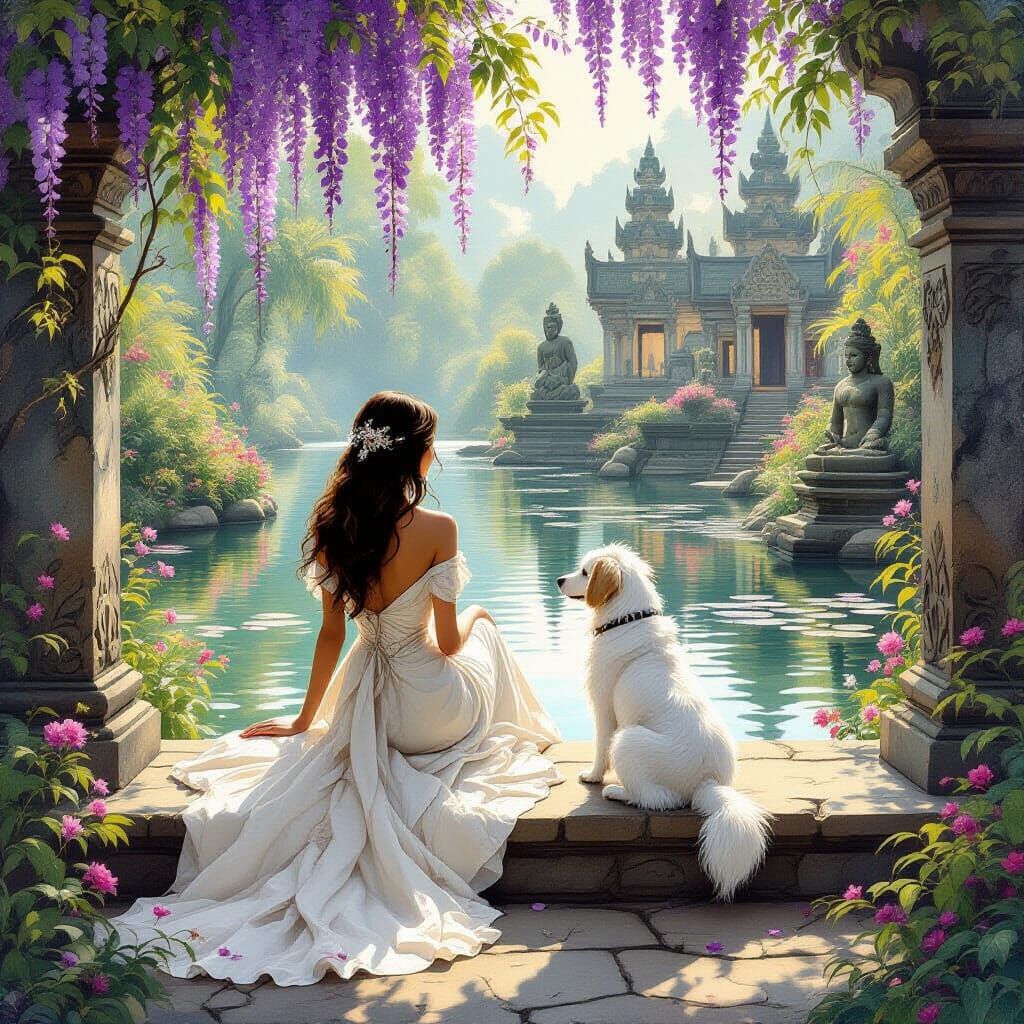 A vibrant impressionistic scene of a woman and her dog in a tropical garden. The digital artwork features temple ruins, stylized foliage and soft golden light, resembling a watercolor painting.