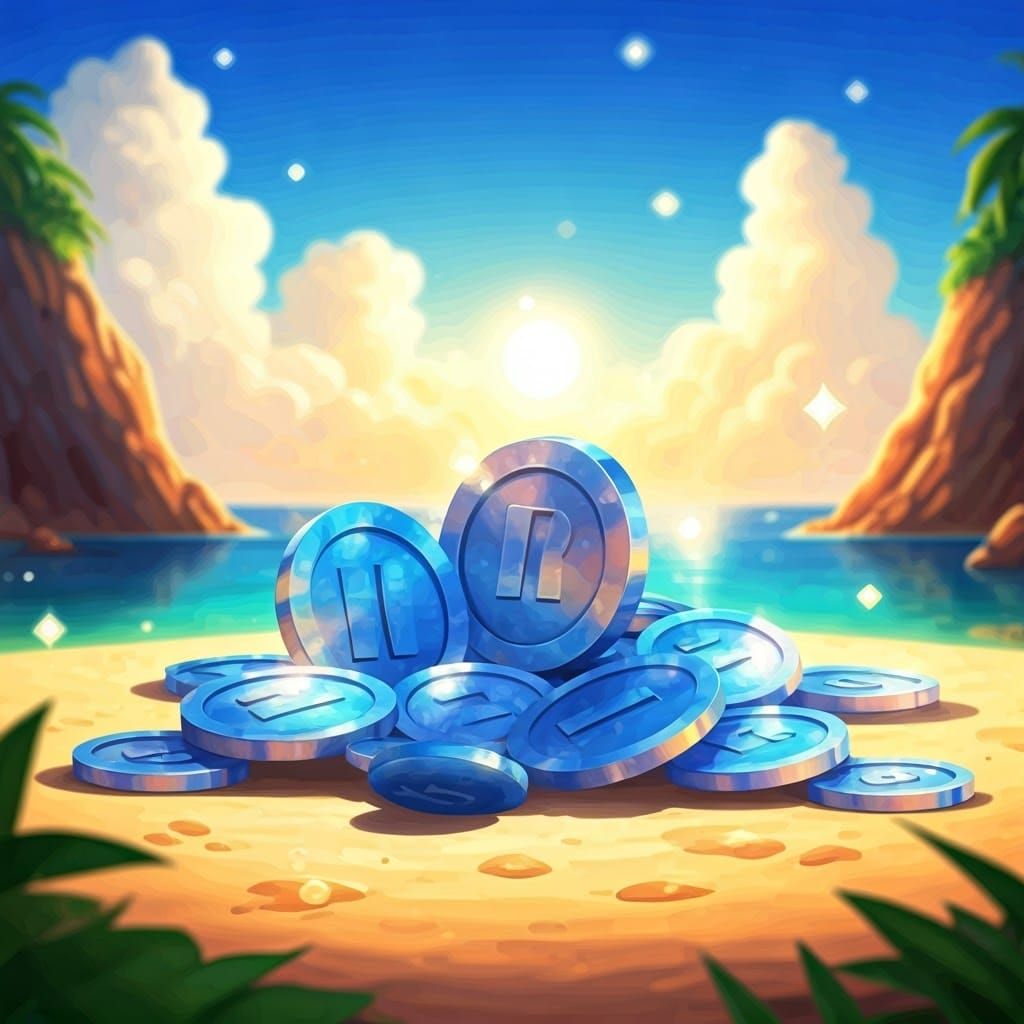 A vibrant image of scattered, shining blue coins on a tropical island. The scene is bathed in a warm, sunny glow, rendered in a playful, colorful digital art style.